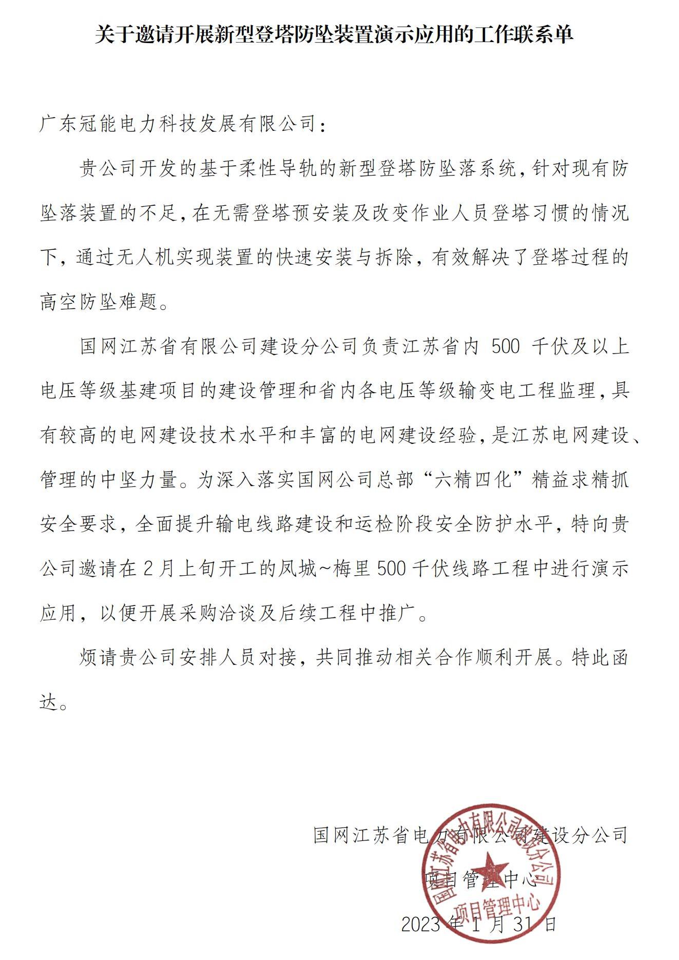 2023年1月31日,冠能公司收到來自國網(wǎng)江蘇省有限公司建設(shè)分公司關(guān)于開展新型登塔防墜落裝置演示應(yīng)用的邀請函,邀請冠能公司2月中旬在江蘇無錫進(jìn)行實(shí)地演示。