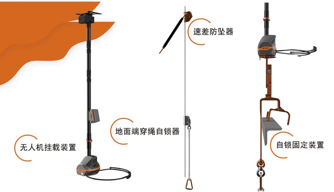 鑒于登塔過程中的安全防護問題仍是困擾當前電力系統(tǒng)安全生產中的一大難題,針對現有防墜工具的不足,冠能科技聯合佛山供電局試驗研究所共同研發(fā)出新型登塔防墜落裝置。在無需人員登塔預安裝及不改變作業(yè)人員登塔習慣的前提下,通過無人機搭載新型登塔防墜裝置飛到鐵塔頂端,利用裝置的重力自鎖緊機械機構實現裝置在塔頂的快速安裝與拆除,安保繩一端固定在新型登塔防墜落裝置上,另一端固定于塔底,登塔人員通過防墜器與安保繩連接后,形成完整的保護措施。有效減緩登塔人員心理壓力,完全避免作業(yè)人員登塔過程中墜落風險,有效保障了登塔人員的安全。